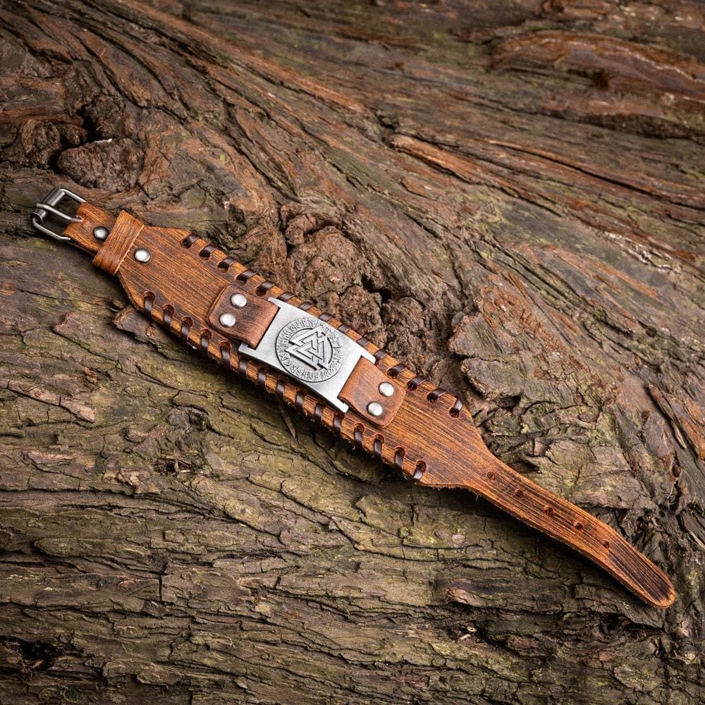 Genuine Leather Buckle Arm Cuff Valknut Rune Metal Bracelet
