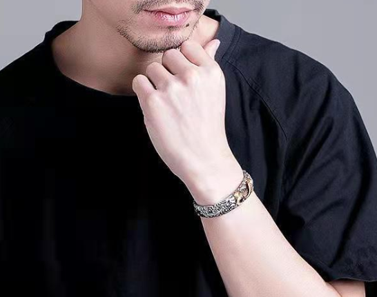 925 Sterling Silver Buddhist Heart Sutra Double Fishes Lotus Open Bracelet