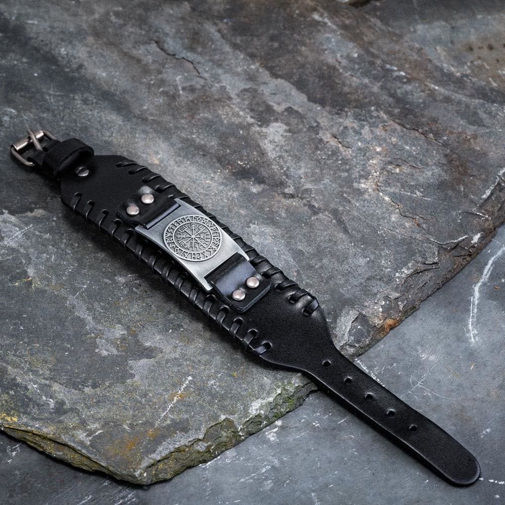Genuine Leather Buckle Arm Cuff Vegvisir Metal Bracelet